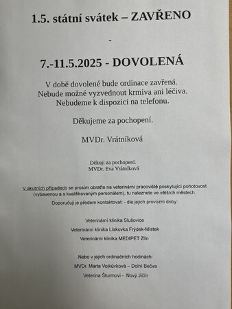 1.5. Zavřeno a od 7.5.-11.5. Dovolená ZAVŘENO